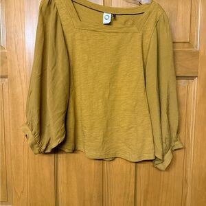 Chic golden blouse with a square neckline. Features relaxed sleeves for a comfortable fit. Ideal for versatile styling.