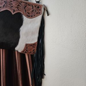 Elegant leather shoulder bag with black and white design. Features intricate detailing and fringe accents. Ideal for a stylish look. 12 inches x 12 inches. Fringe is 13 inches and bag drop with double straps is 17 inches