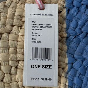 NWT Vineyard Vines Woven Straw Round Tote Natural w/Deep Bay Sky Blue & White Stripe