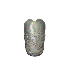 The iridescent Imperial Glass carnival glass creamer boasts a charming grape and leaf pattern. Its vintage design and shimmering finish make it an elegant addition to tableware or collectibles.
