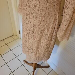 pink lace dress, Adriana Papel size 12, formal occasion dress, vintage-inspired sheath, blush mesh overlay, floral lace detail, fitted cocktail dress, modest event attire, wedding guest dress, mother of the bride dress, elegant party dress, semi-sheer sleeves, women’s formalwear, classic feminine style, bra loop snaps, romantic lace dress, modern vintage chic, special occasion outfit, spring summer event, tea length dress, evening dress for women, timeless lace look, delicate floral detail