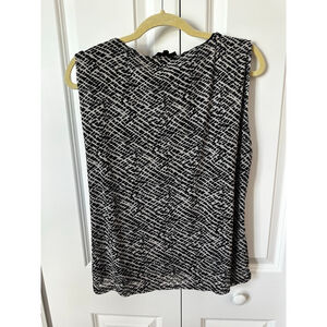 This is a pre-owned JANE + DELANCEY women's tank top in size XL, featuring a black and white abstract geometric pattern. The sleeveless top has a V-neckline with central ruching down the front. The back is smooth with the same pattern. The fabric composition is 95% polyester and 5% spandex for the self, with a 100% polyester lining. The garment appears to be in good condition with no visible imperfections.