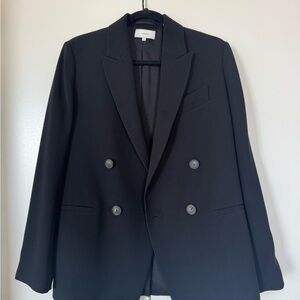 Chic black blazer with double-breasted design. Ideal for versatile styling. Size 2 but fits like a 2-4 with room for layering. New without tags but never worn (tacking stitch on the back side slit still in tact).