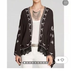 Dark gray/slate color with white embroidery. 100% rayon. Has wide sleeves. Lace detail on the hem. Length is 25 inches. Very roomy so could probably fit multiple sizes.