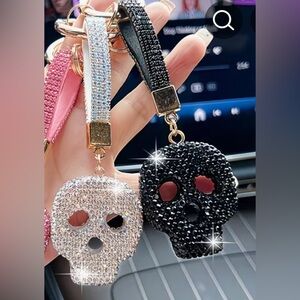 Set of dazzling skull keychains. Features black and white rhinestones. Perfect for adding a touch of glam.