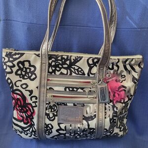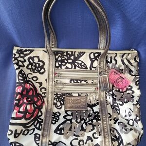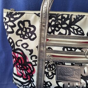 Stylish and spacious, this Coach tote bag features a unique graphic design in black and cream. Perfect for everyday use, it combines fashion with functionality.