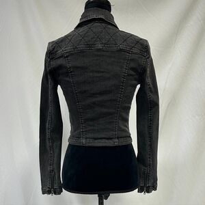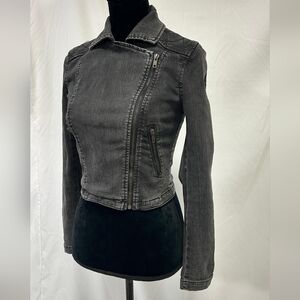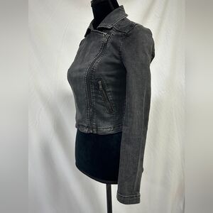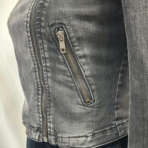 Silence + Noise OU women S moto jeans biker jacket gray wash gorpcore cropped, quilted shoulder detail, 80% cotton, 19% polyester, 1% spandex.
