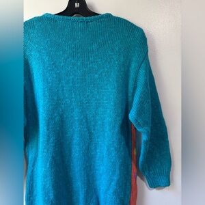Elevate your style with this vibrant knit sweater, featuring a striking mix of teal, orange, and pink. Perfect for adding a pop of color to any outfit.