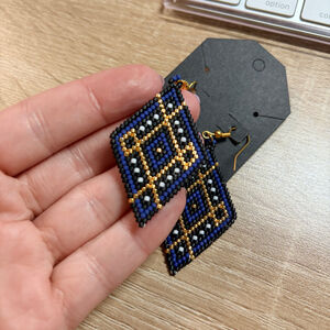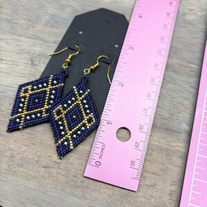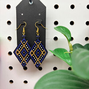 Handmade earrings feature a diamond shape crafted from intricate beadwork. The design incorporates blue, gold, black, and white seed beads arranged in a geometric pattern. Each earring is suspended from a gold-toned ear hook. Brand new, never worn