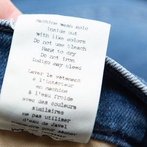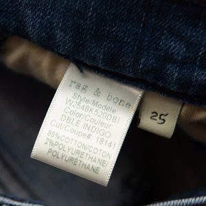 Rag & Bone Mazie High Rise Skinny Jeans in Double Indigo size 25. A high-rise classic skinny fit jean with indigo racing panel detail along the side. 10oz stretch Japanese denim in two-tone indigo wash. Colorblock panel at side seam. Zip fly closure, functional front pockets. Good preloved condition. No holes, stains or rips. Measurements in photos.