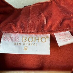 This is a velvet floral embroidered open front cardigan jacket by belle by Kim gravel. Kimono style. Very bohemian and artsy. Machine wash. Polyester.