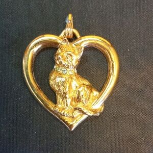 Vintage Avon gold-tone cat in a heart pendant with light blue Rhinestone Collar