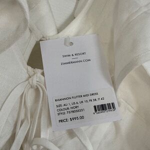 Beautiful white maxi dress by Zimmermann. Features elegant ruffle neckline and tie front. Ideal for stylish outings. Size 1, tag are attached.