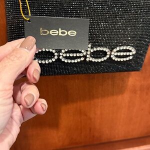 Elegant Bebe evening bag with shimmering black finish. Includes a sleek chain strap and bold logo accent.