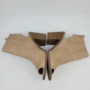 CIRCUS Sam Edelman Kammi Tan Faux Leather Cutout/Open Toe Ankle Boot, size 8.5. Outer zip, chunky stacked block heel, cutout heel detail, open/peep toe. Excellent pre-owned condition.