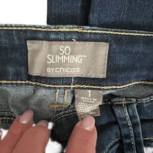 Stylish and stretchy dark blue jeans with a light wash by Chico's. Straight leg design and cropped with stud details on front and back pockets. Very comfortable and stylish for versatile wear.