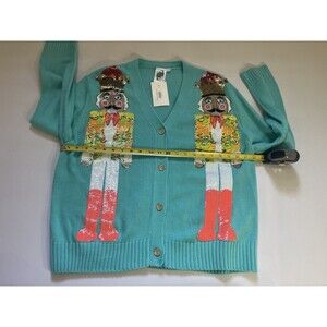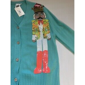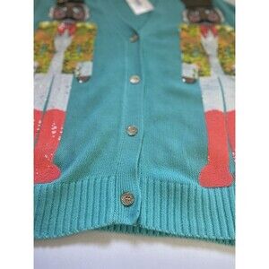 Queen of Sparkles teal knit cardigan featuring two fully sequined nutcracker designs on the front. Button-front closure with ribbed cuffs and hem. Festive holiday statement piece with detailed embellishment and vibrant colors. Soft knit fabric with a structured fit. New with tag attached.