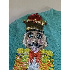 Queen of Sparkles Nutcracker Sequin Cardigan Sweater Teal Button Front – Medium