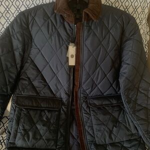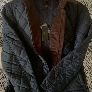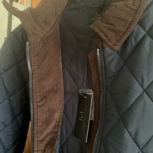 NWT Magaschoni Unisex Navy Chocolate Quilted Jacket with Brown Collar