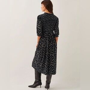 Pick of the season. Blossoming with little white flowers all over, this dress is designed in forever-faithful jersey with a shirred bodice, ruffle neckline and midi-length skirt. Did somebody say comfort?