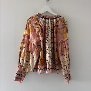 The Farm Rio Jaipur Blouse features a vibrant floral print with a delicate V-neckline and long puffed sleeves for a refined, romantic silhouette.