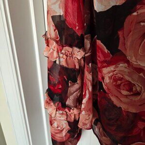 Chic and sheer WHBM blouse with vibrant red and pink rose pattern. Long sleeves with ruffle detail. No tags but this blouse has never been worn.
