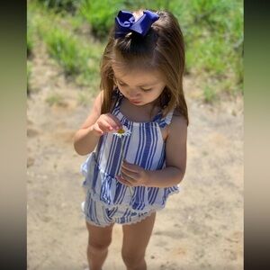 BEAUTIFUL Jessica Simpson romper with blue and white stripes. Features ruffled layers and lace trim. Top back has two button closure, for easy on & off. Lightweight and flowy material. Decorative bows on shoulder straps. Includes matching headband.