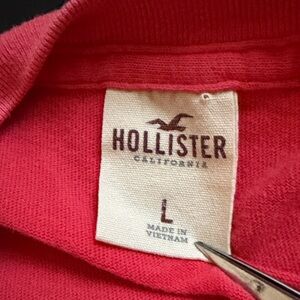Vibrant red tee with bold 'Hollister Surfer' text and seagull design. Perfect for casual wear.
