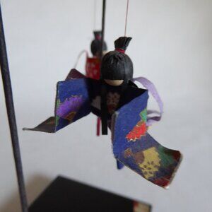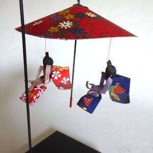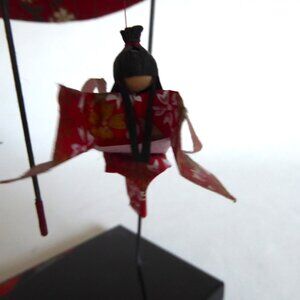 Vintage, Japanese, handcrafted, origami, washi paper, mobile. It depicts two geisha wearing kimonos, dancing under a suspended umbrella. It is mounted to a lacquer finished black base. (See photos for details.) I am the original owner as it was acquired in Japan. It has been in climate controlled storage for decades. Comes from a pet and smoke free home.