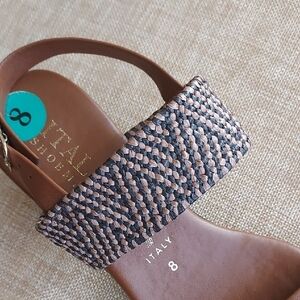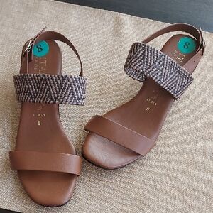 Elegant brown sandals with a woven strap. Super comfortable! Made by Italian Shoemakers. Made in Italy. These are in very good condition.