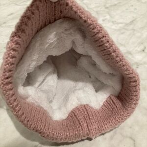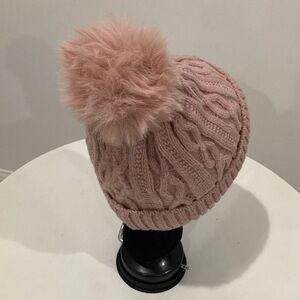 NEW Chanel Embroidered Pink Winter Cable Knit Hat Faux Fur Pom