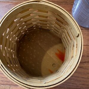 Stylish Longaberger basket with a woven tan design. Features a sleek silver knob on the lid. Perfect for adding a rustic touch to your decor. It comes with plastic protector and wood craft wood.