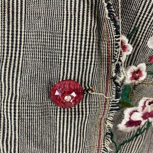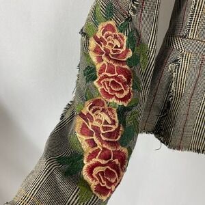 Keywords: embroidered jacket, floral blazer, striped jacket, distressed blazer, rose embroidery, designer jacket, statement jacket, unique fashion, artistic clothing, boho chic, feminine edge, fashionable blazer