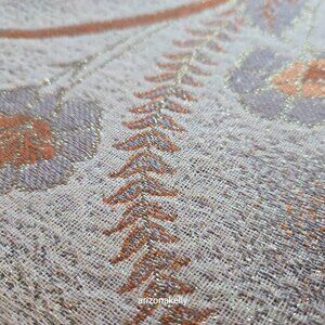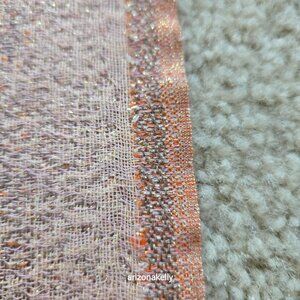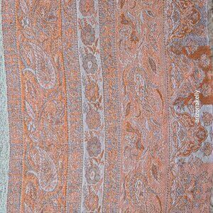 Wool jacquard scarf in what appears to be unused condition. Thin metallic threads are interwoven into the scarf to give it a slight shimmer. Lovely pastel orange colors.