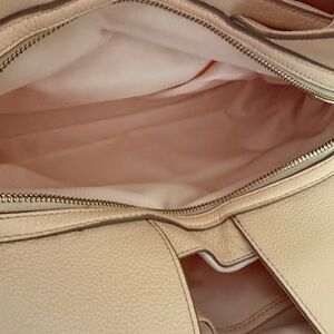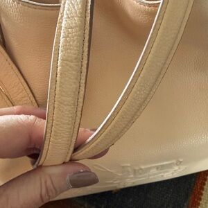 She is peach in color and is gorgeous! You are buying preowned and there are a few scuff marks but overall it is in beautiful great condition. Chic Coach shoulder bag in peach leather. Features embossed design and elegant gold hardware. Very clean. One owner. I carried this a dozen times and it’s been in the dust bag since (which is included with purchase). The first pic shows the best color match.