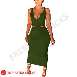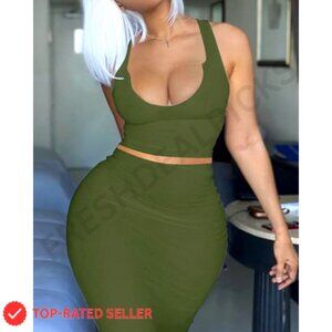 Brand new with tags, this elegant two-piece skirt set delivers a sexy, bodycon look perfect for nights out, beach vacations, or elevated casual wear. The soft, stretchy ribbed knit fabric is comfortable, breathable, and creates a flattering silhouette.