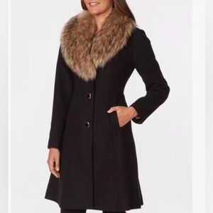 She is stunning!! Elegant black coat with luxurious faux fur collar. Perfect for a sophisticated look.