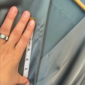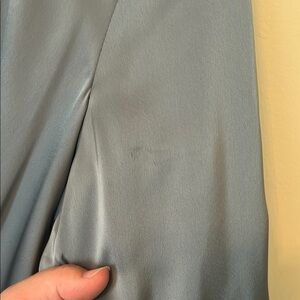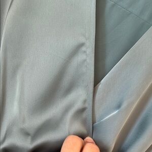 GUC—This dress was worn once for a wedding shower by the mother of the bride. Along the v neck, there is a pull and hole from where a safety pin was used to secure the chest (see photos), there is an iron stain right below the waist. See photo of 3 lines. On the sleeves and the back of the dress there are 5 imperfections. It’s hard to tell if they are stains or just the fabric wrinkled funny. But they’ve all been photographed up close. You can see from the main photos that these are hardly visible unless looking closely.