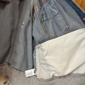 Chic jacket with blue denim body. Gray sleeves and hood add contrast. Perfect for casual wear.