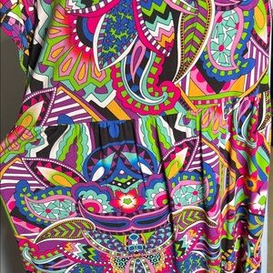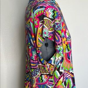 Vibrant dress with a V-neck design. Features a multicolor abstract pattern.