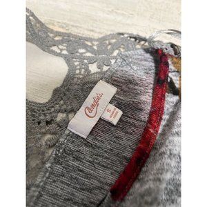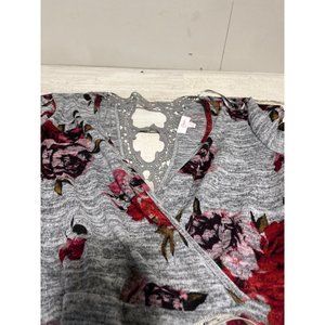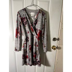 Candie’s long sleeved v-neck grey floral dress size small. Has grey crochet work in back. Pit to pit measures approximately 18.5”. Shoulder to hem measures approximately 35”. Good pre-owned condition.