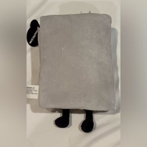Soft gray plush book with a cute embroidered face and text. Perfect for book lovers.
