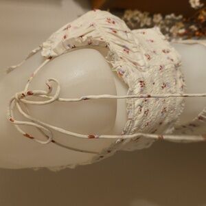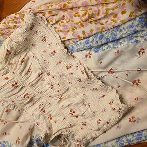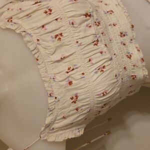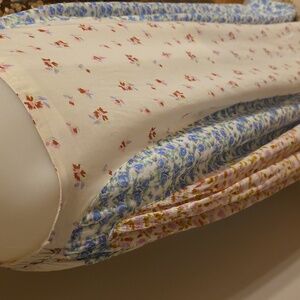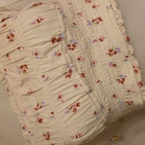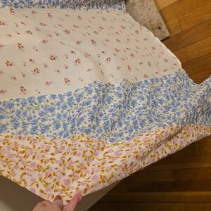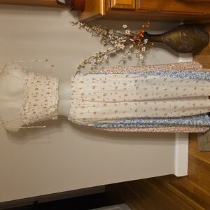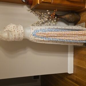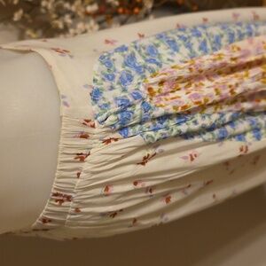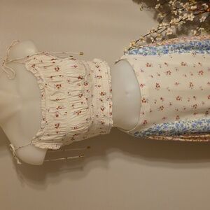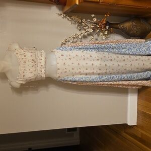 Embrace a bohemian vibe with this floral patchwork maxi skirt. Featuring a blend of cream, blue, and pink hues, it's perfect for a chic, effortless look. Pull on style elastic back full maxiskirt with 1/2 liner. Matching elasticized spaghetti strap crop tank top. Both size small. Fits tts or even XS due to elastic. Like new condition. Gorgeous ๐