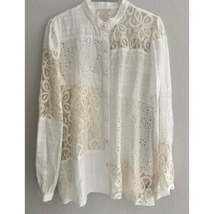 Excellent condition gentle wear no flaws. Details: Evoking wanderlust imbued with a wistful charm, this shirt is made from a comfortable material and boasts a high collar, long sleeves, a button front, and a bohemian lace patchwork design comprising plaid and floral patterns. Comes with white liner tank top. Oversized fit. Material: Cotton. Dry clean. Oversized fit. Laying flat: pit 18.5 inches; pit to cuff 18 inches; length 25.5 inches; shoulder 14 inches.