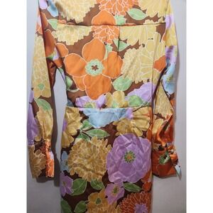 A vibrant floral print dress brings a touch of retro charm to your wardrobe. This striking piece features a classic collared neckline, long sleeves with button cuffs, and a flattering tie waist that cinches your silhouette. The bold, colorful floral pattern pops against the rich brown background, creating a look that's both playful and sophisticated. Perfect for a brunch date, a garden party, or a stylish day out.