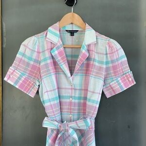 Stylish plaid dress with a belted waist. Features pink and blue colors. Perfect for casual outings.