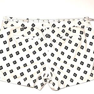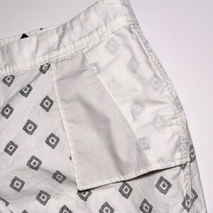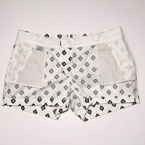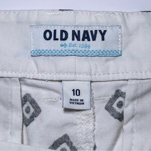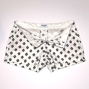 Old Navy white chino short-shorts with a black geometric diamond print. They feature a zip and button closure, belt loops, side slip pockets and back horizontal slit pockets. 100% cotton, machine washable. Perfect for casual outings or a day at the beach. Women’s size 10 in excellent preowned condition.