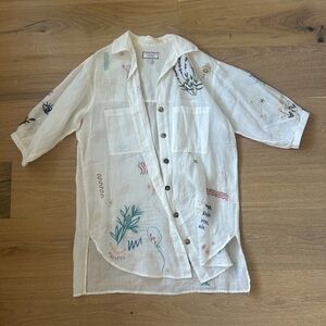 This relaxed button-down shirt by Johnny Was features a crisp white and blue color palette with a classic dress shirt collar. The 3/4 sleeves and buttoned front offer a comfortable yet stylish fit, perfect for both casual and semi-formal occasions.