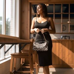 Stylish leopard print bag and wallet set with a chic design. Features gold chain shoulder strap and gold hardware. Perfect for adding a bold touch to any outfit. Apx 10x6x3