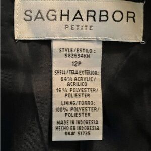 Chic tweed blazer by Sag Harbor. Features a stylish navy and pink pattern. One button closure. Navy satin lining. Single vent back. Easily pairs with dress pants, skirt, or jeans.